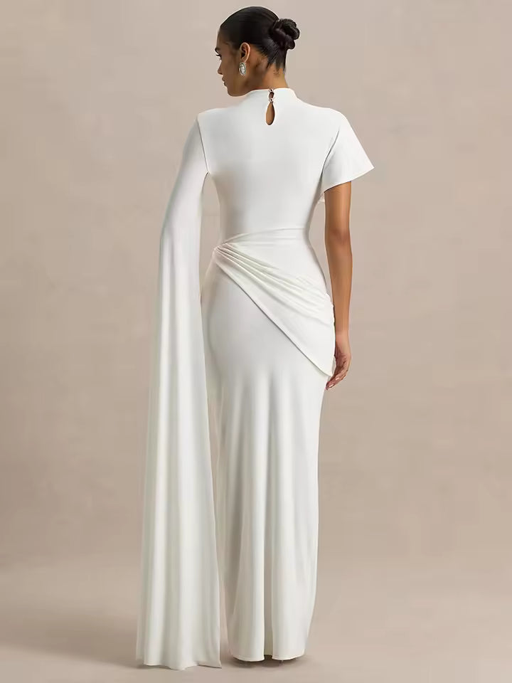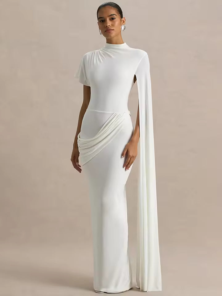 Sa coupe sirène épouse le corps avant de s’évaser légèrement à partir des genoux, offrant un tombé fluide et harmonieux. Cette robe allonge la silhouette et souligne les courbes avec finesse — idéale pour une allure chic et confiante.